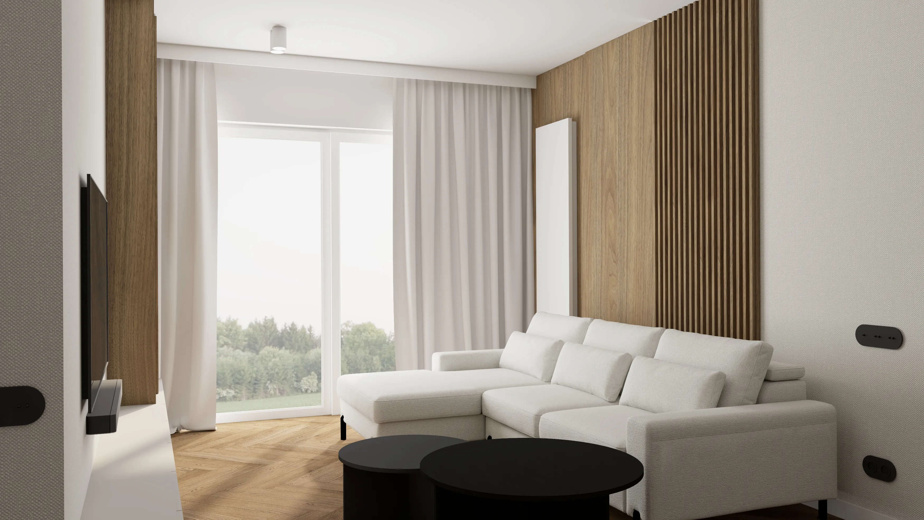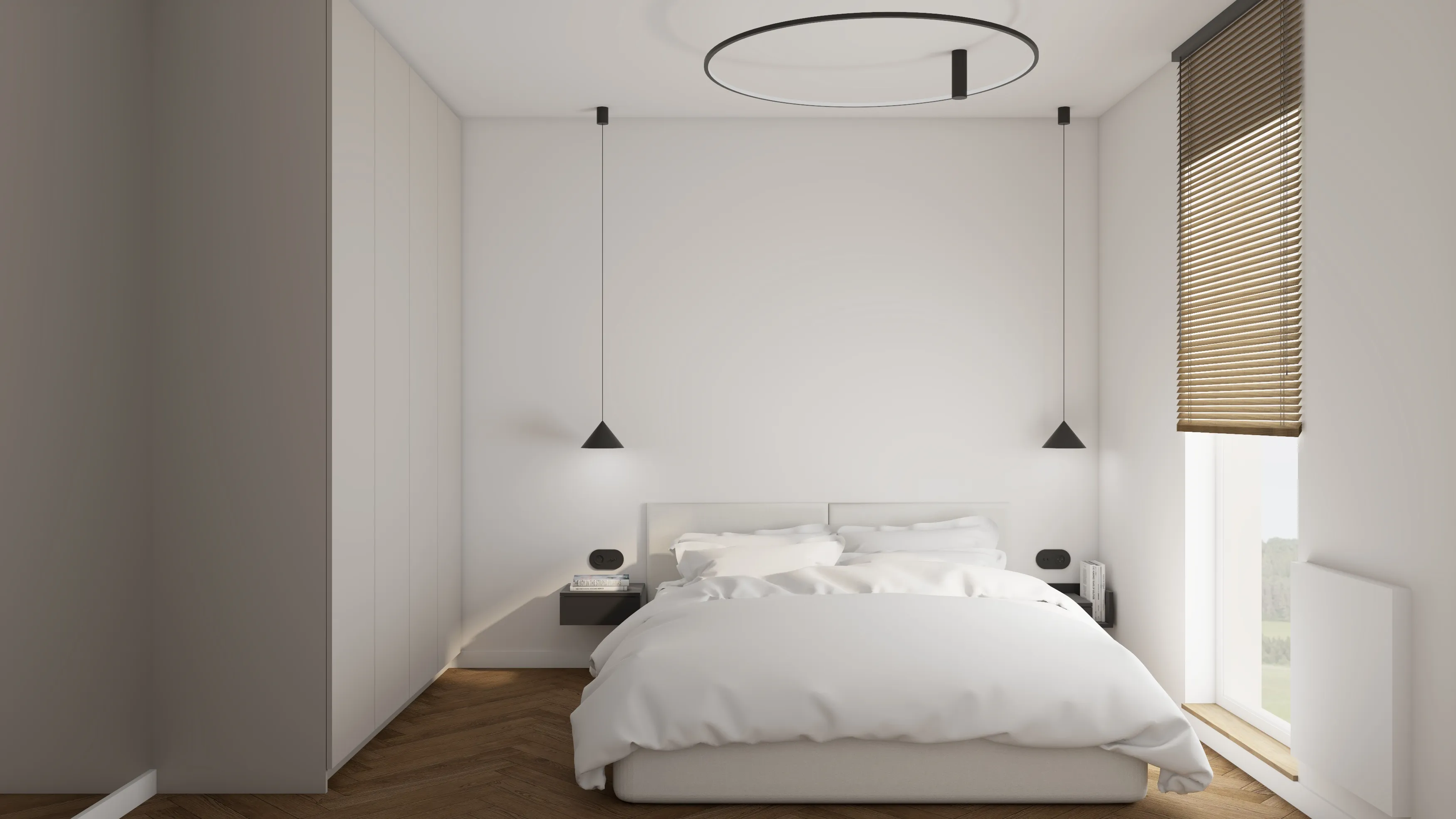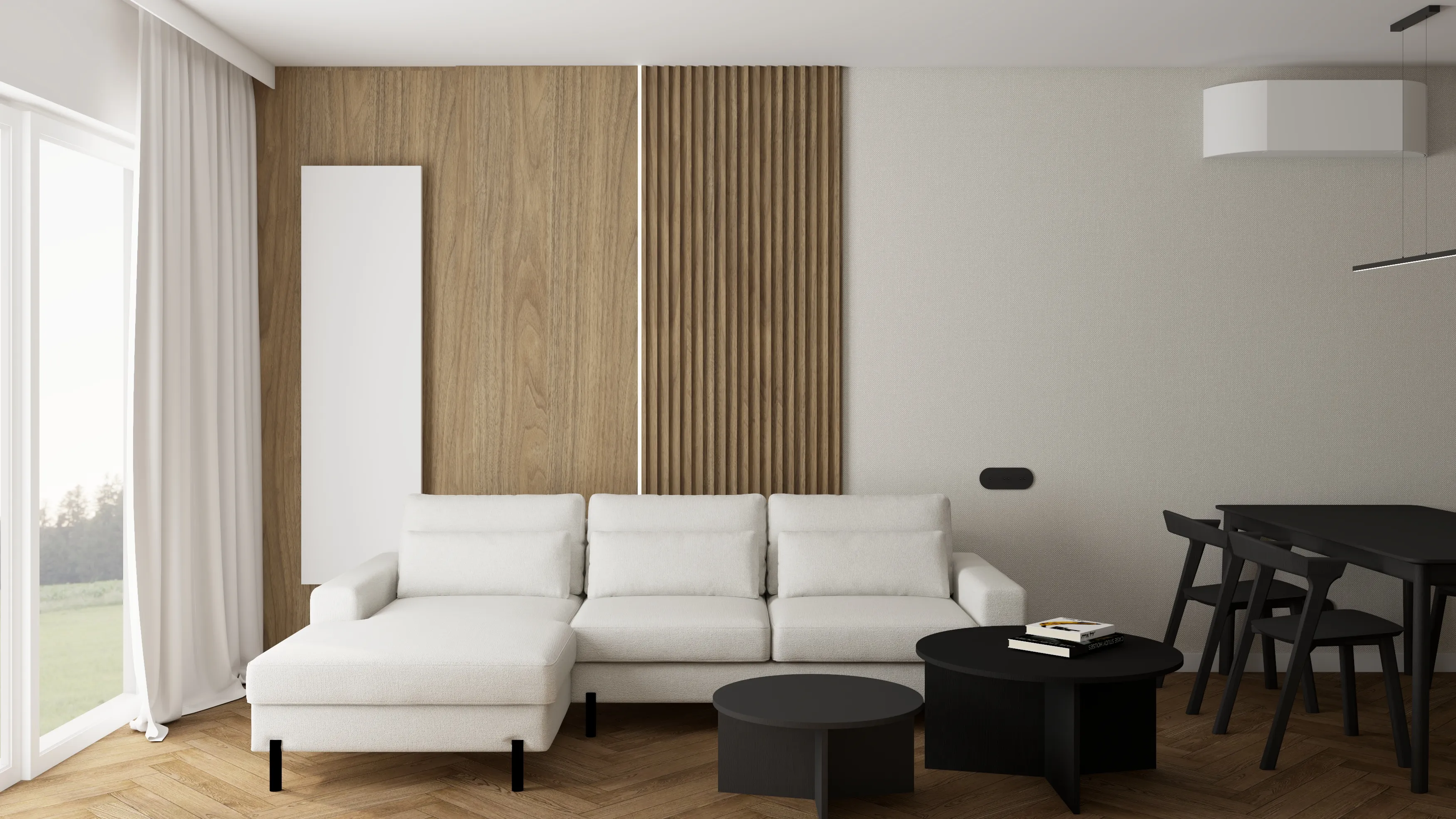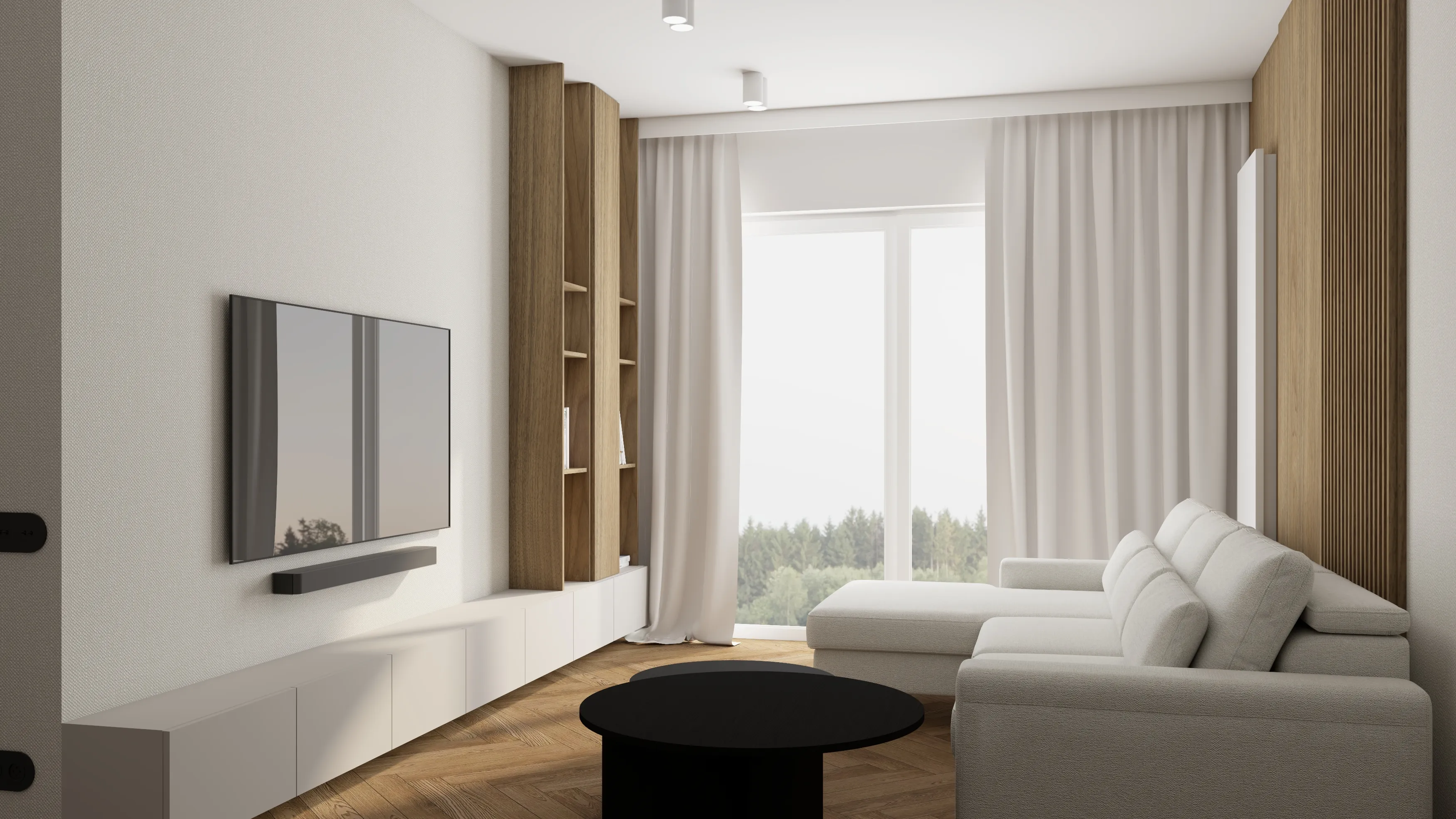 Jasne, męskie wnętrze uzupełnione czarnymi dodatkami. Ponadczasowa przestrzeń w jasnych barwach. Zastosowanie tapety imitującej tkaninę w połączeniu z okładziną drewnopodobną nadaje wnętrzu przytulności. Czarne akcenty w postaci mebli ruchomych, oświetlenia oraz osprzętu nadają całości męskiego charakteru.