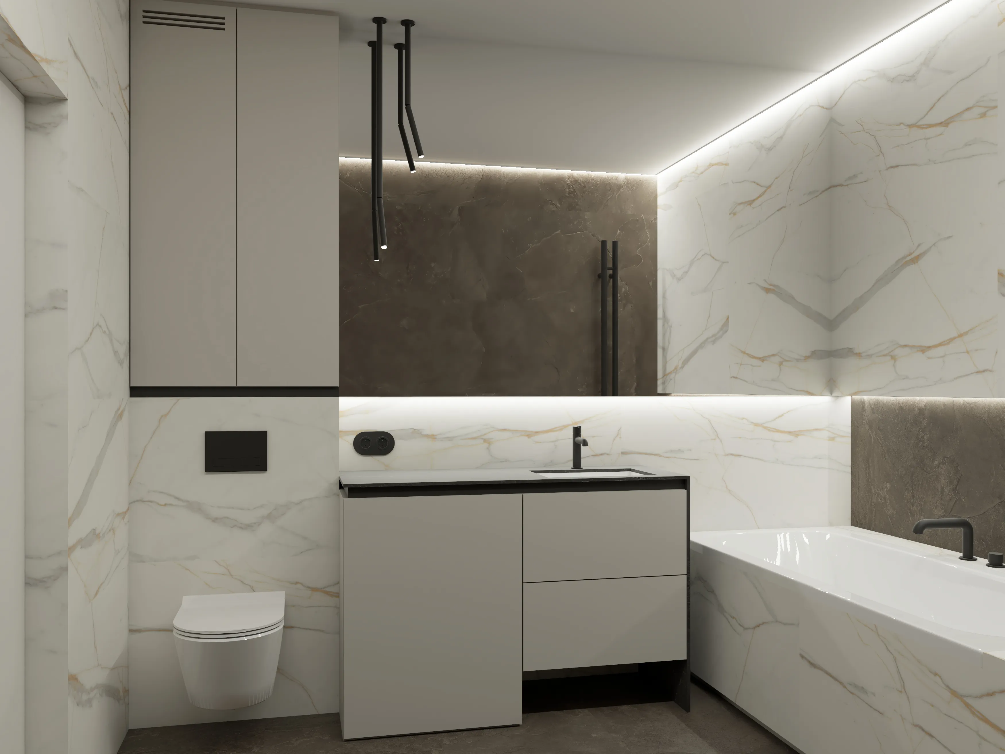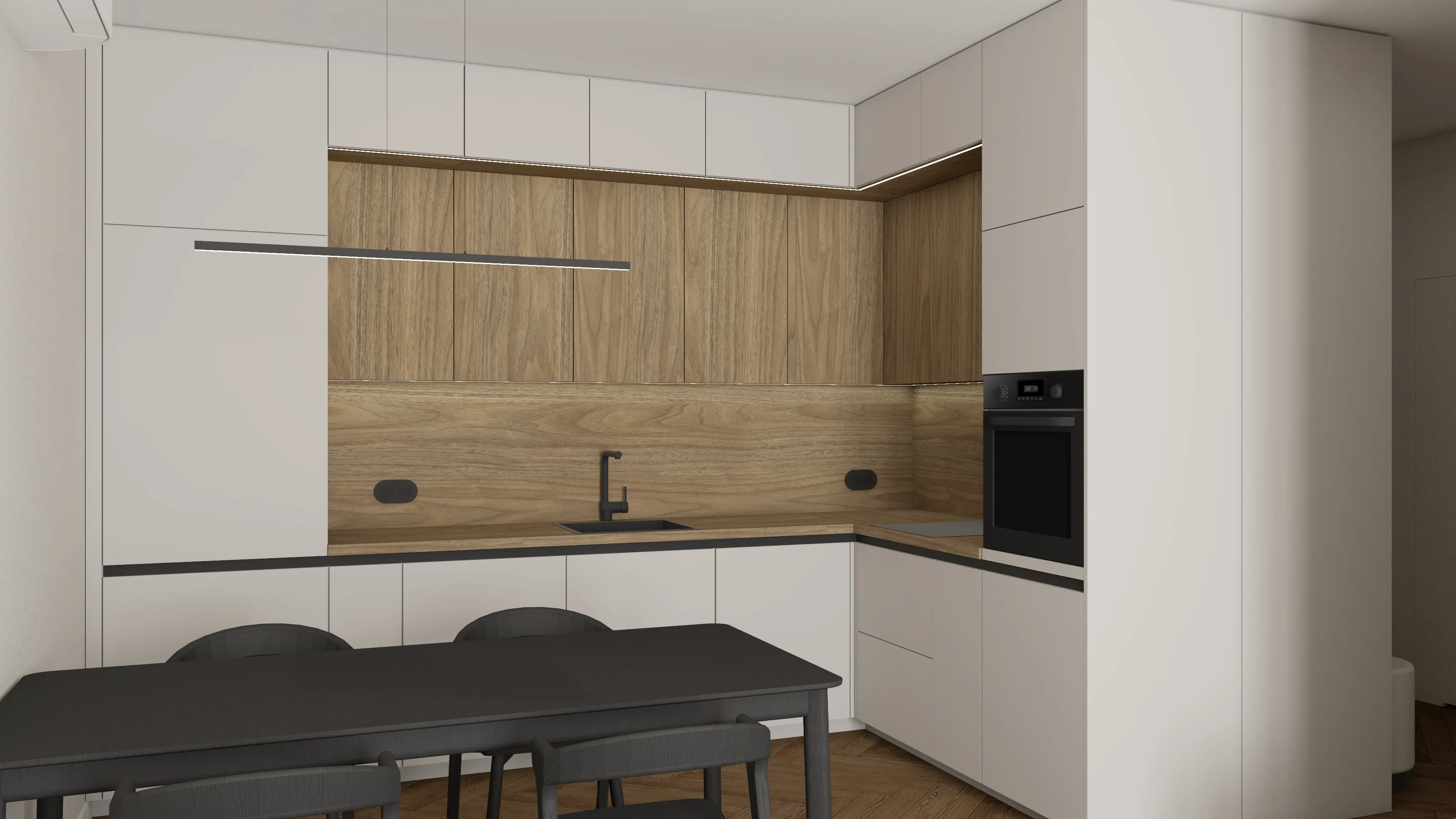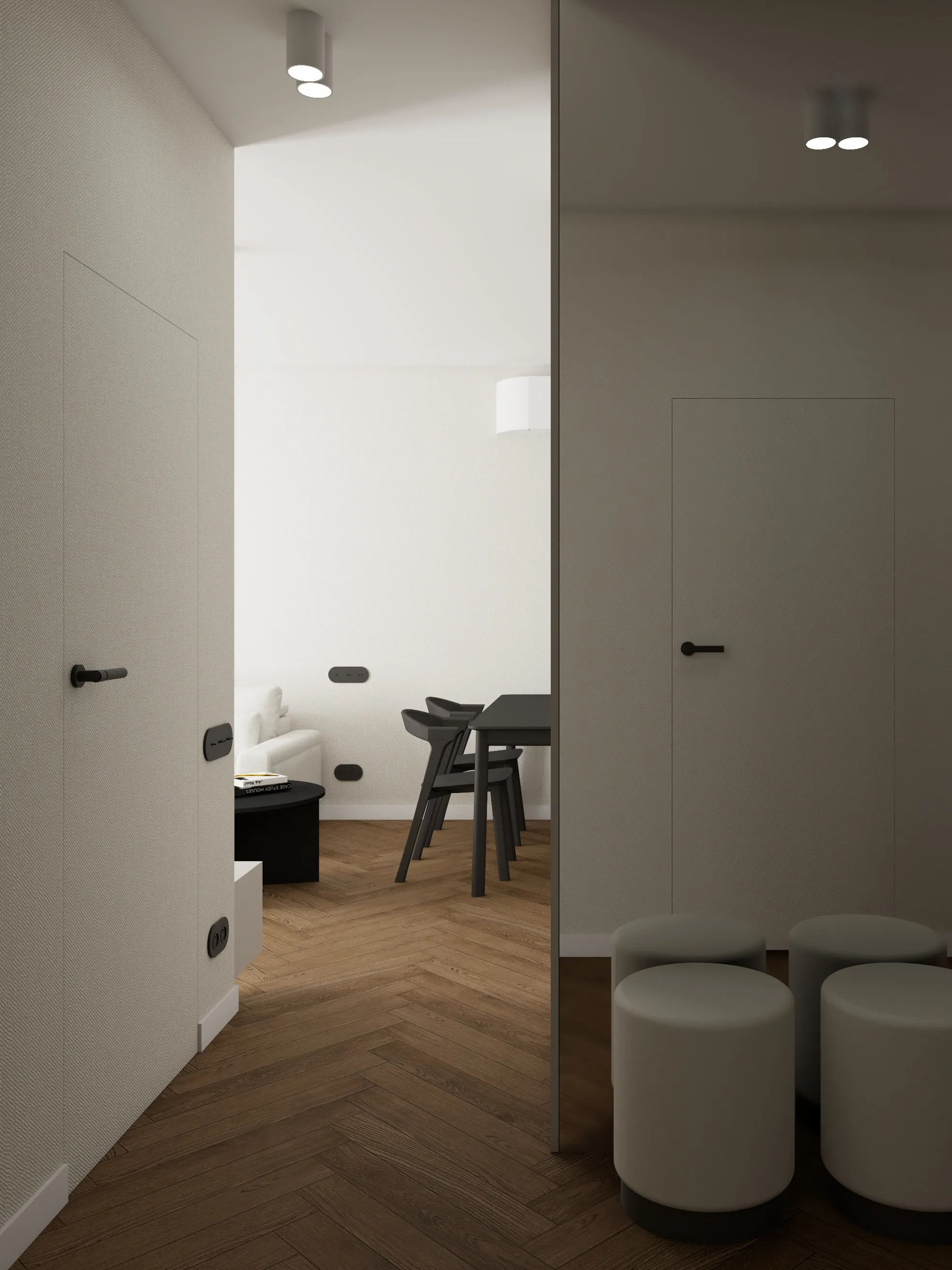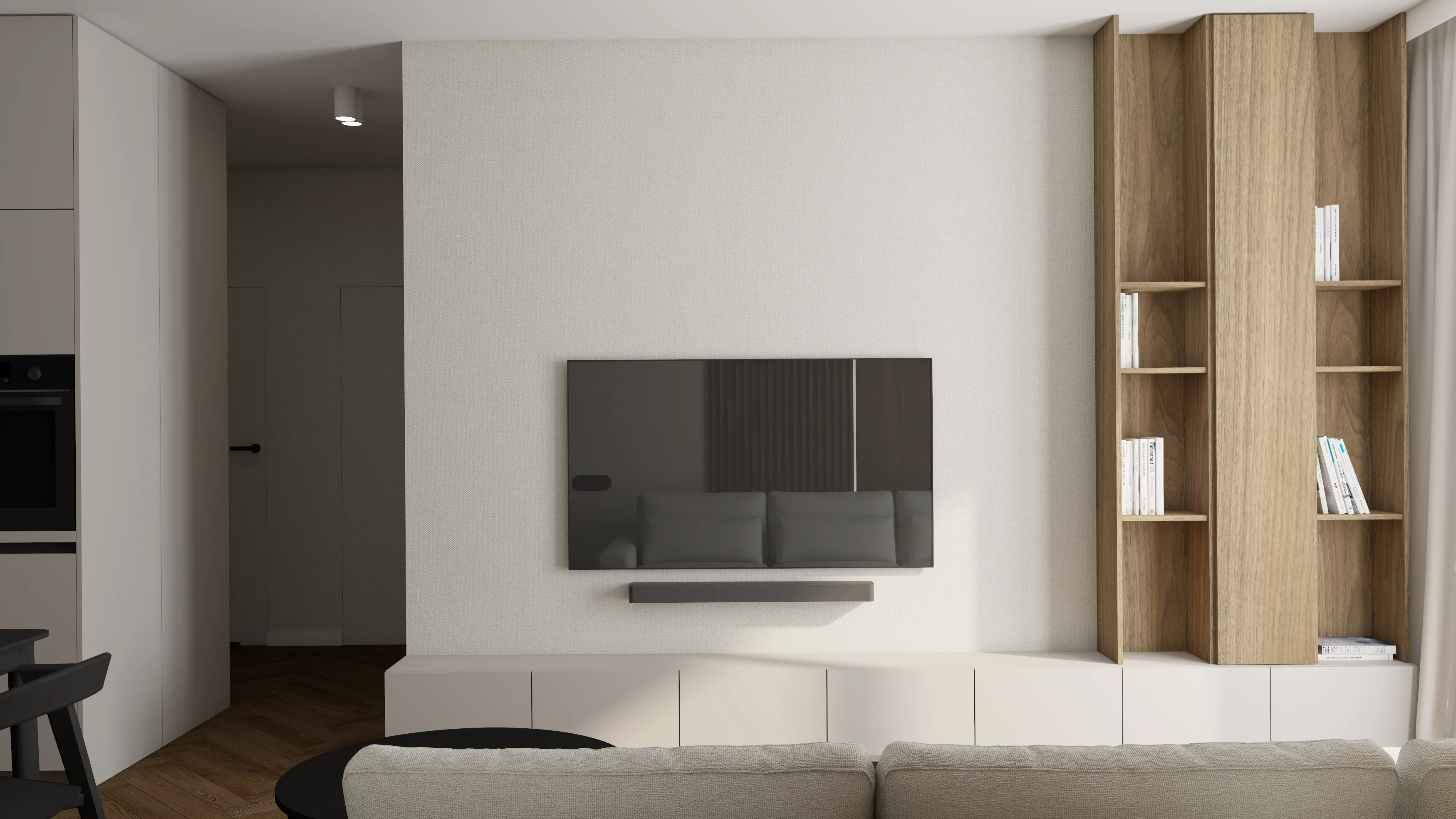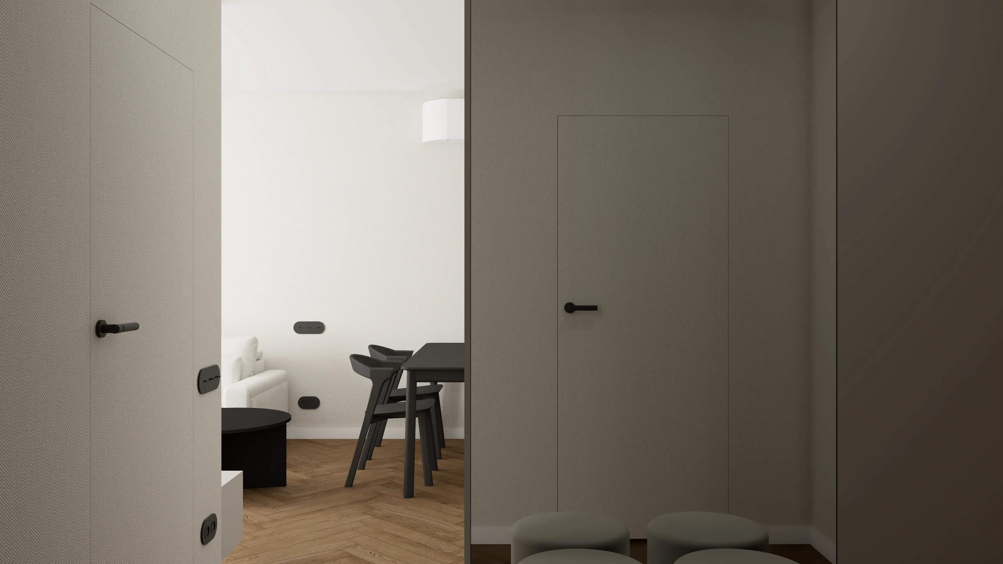 Jasne, męskie wnętrze uzupełnione czarnymi dodatkami. Ponadczasowa przestrzeń w jasnych barwach. Zastosowanie tapety imitującej tkaninę w połączeniu z okładziną drewnopodobną nadaje wnętrzu przytulności. Czarne akcenty w postaci mebli ruchomych, oświetlenia oraz osprzętu nadają całości męskiego charakteru.